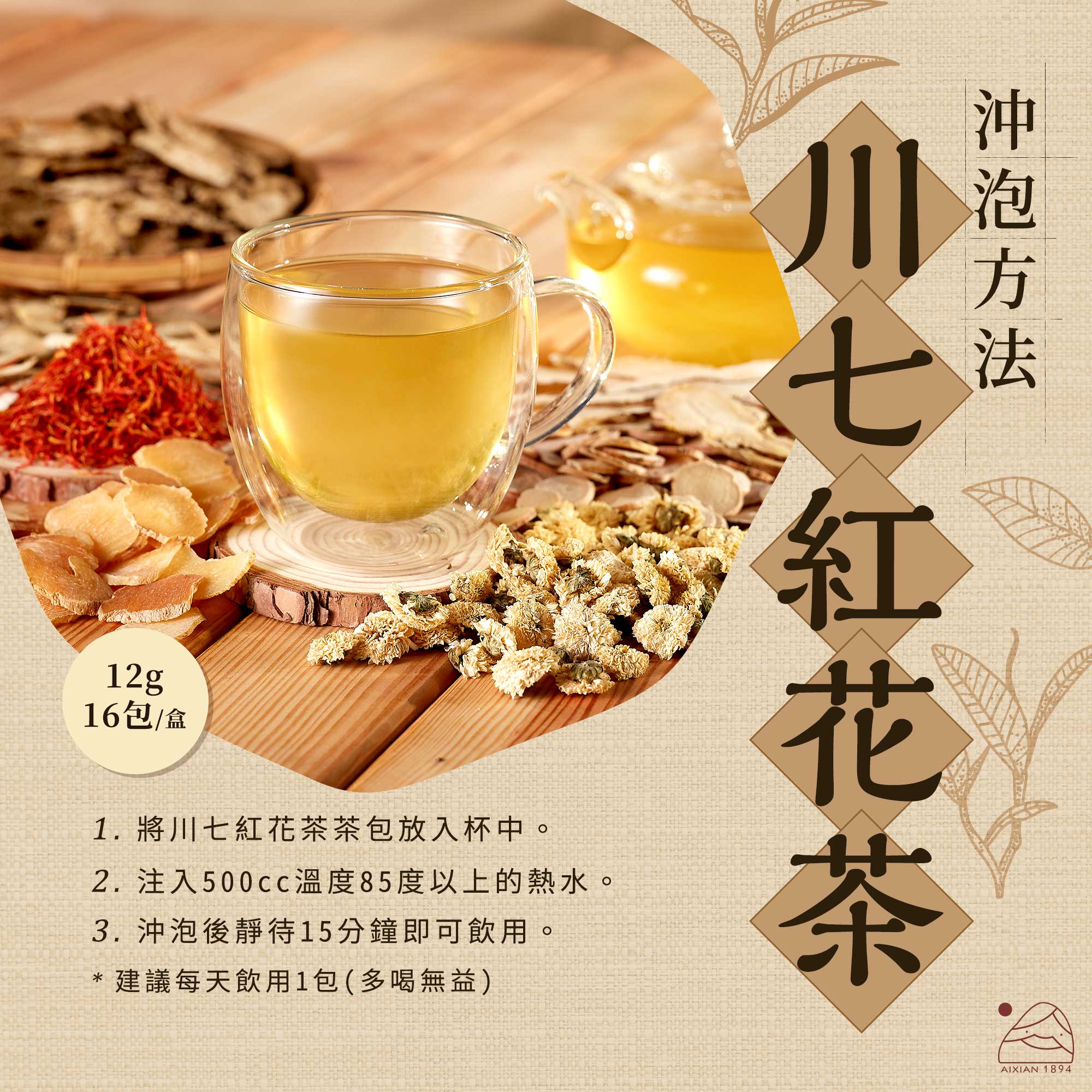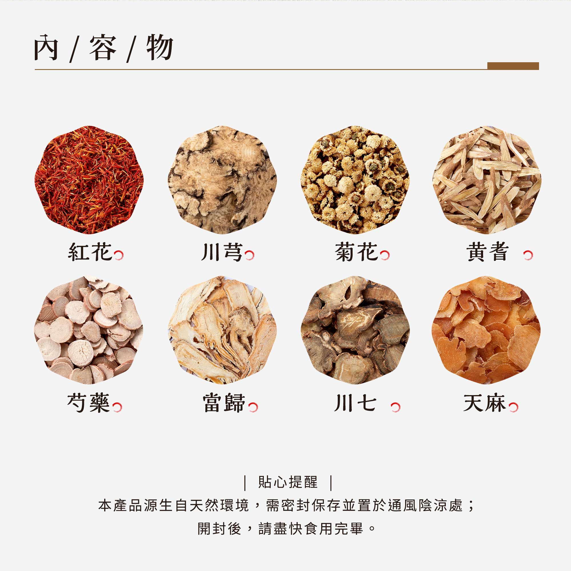 內容物: 紅花/川芎/菊花/黃耆/芍藥/當歸/川七/天麻