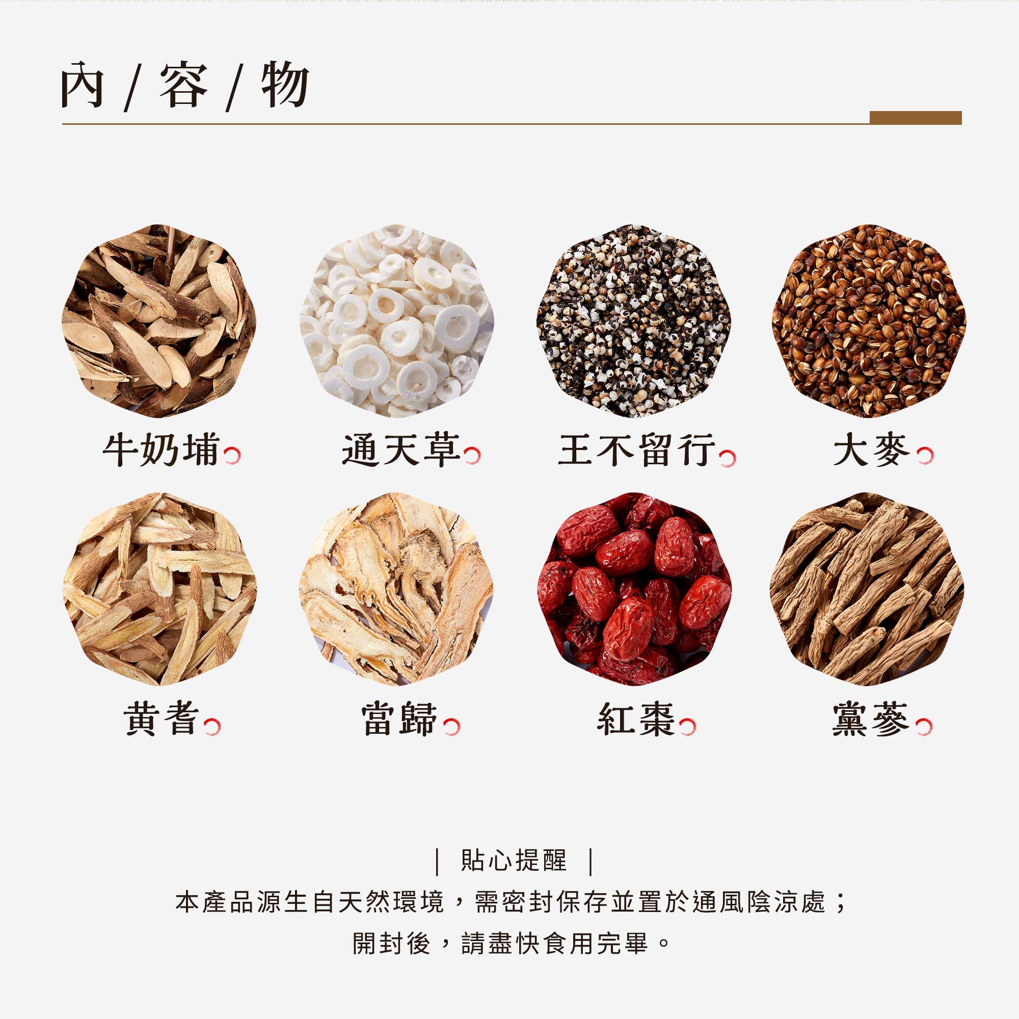 內容物: 牛奶埔/通天草/王不留行/大麥/黃耆/當歸/紅棗/黨蔘