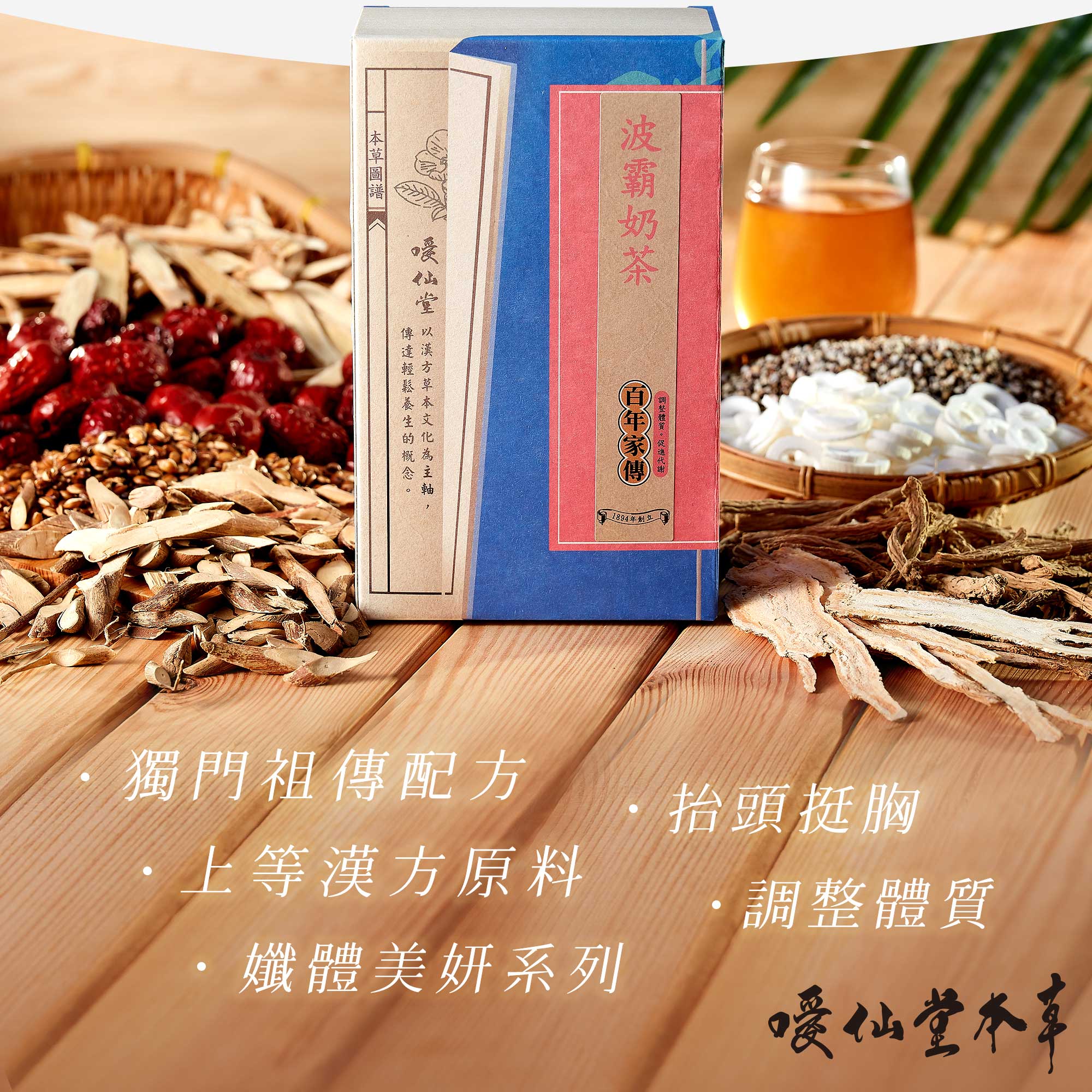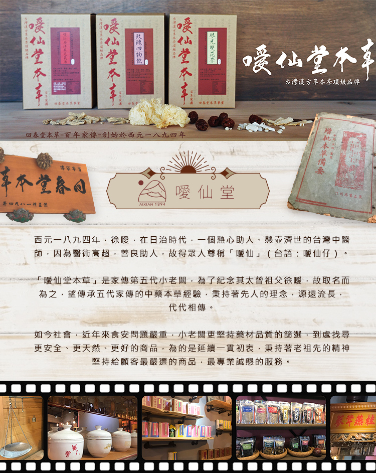 噯仙堂本草擁有百年五代家傳的本草中藥經驗,以漢方草本為基底,結合現代生物食品科技技術,研發出沖泡式漢方草本茶包,獨家調配完美比例,口感溫潤,所有的產品皆嚴選藥材研製而成,絕不使用食品添加物及調味料,100%純天然,讓您喝得健康無負擔。