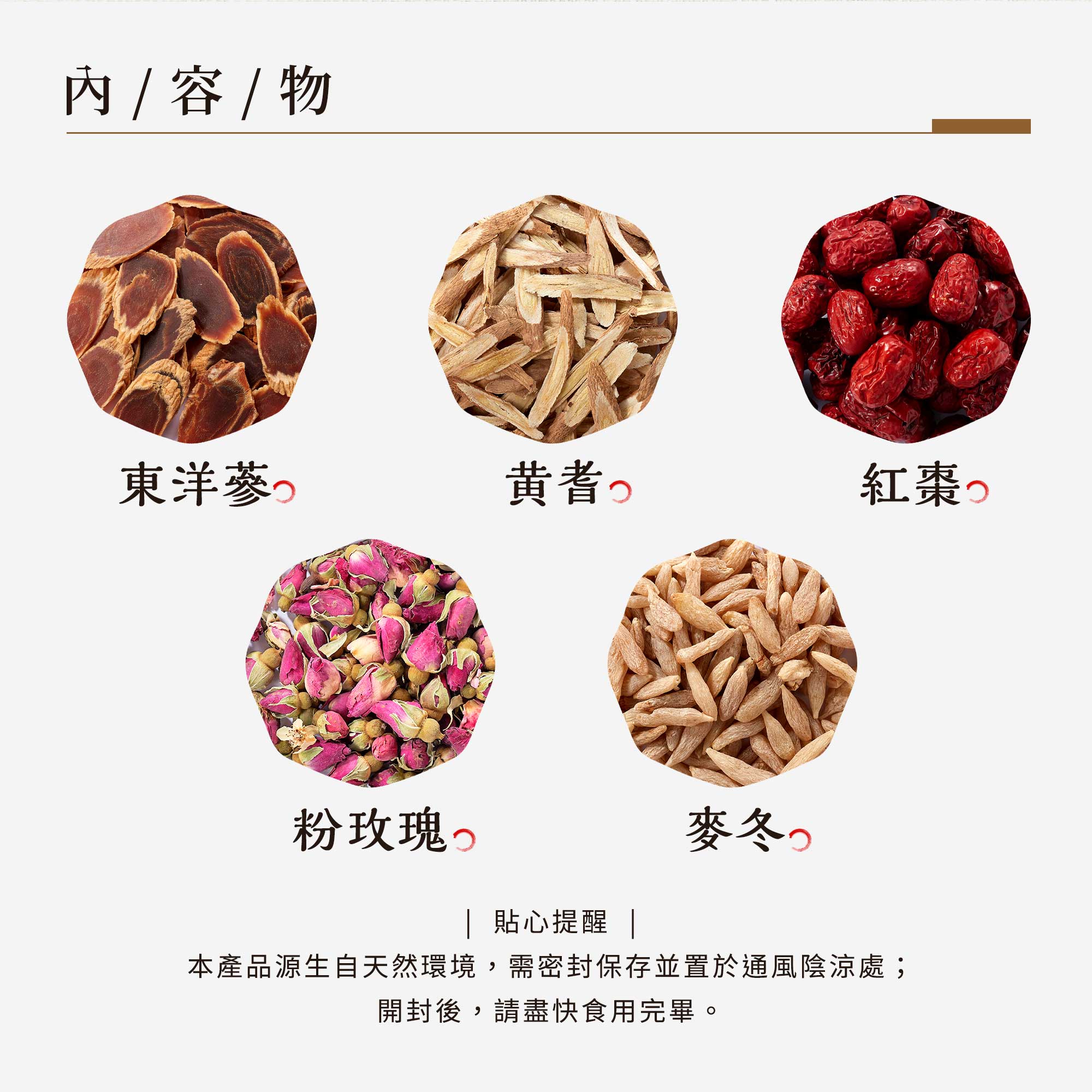 內容物: 東洋蔘/黃耆/紅棗/玫瑰/麥冬