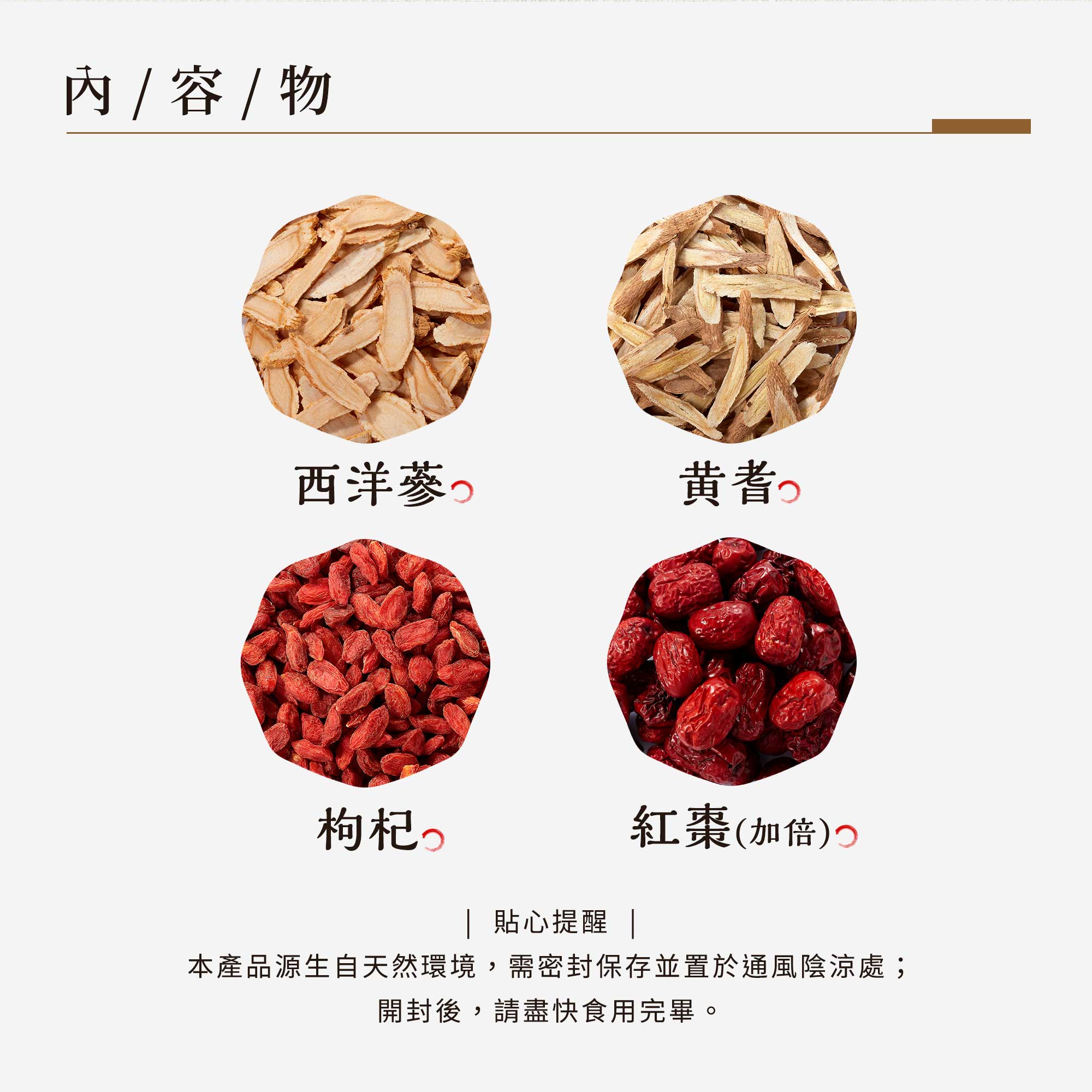 內容物: 粉光蔘/黃耆/枸杞/紅棗(紅棗加倍)