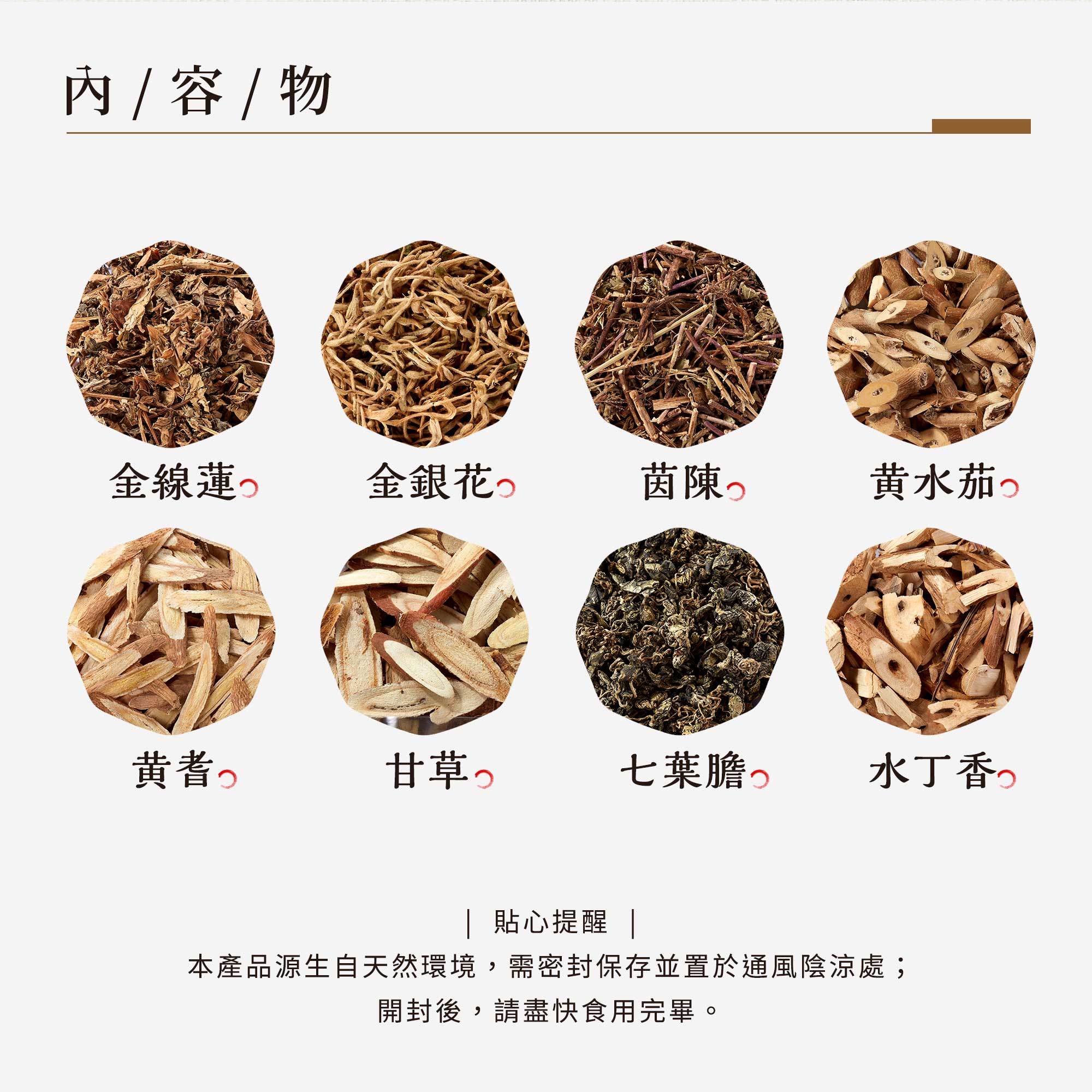 內容物: 金線蓮/金銀花/茵陳/黃水茄/黃耆/甘草/七葉膽/水丁香