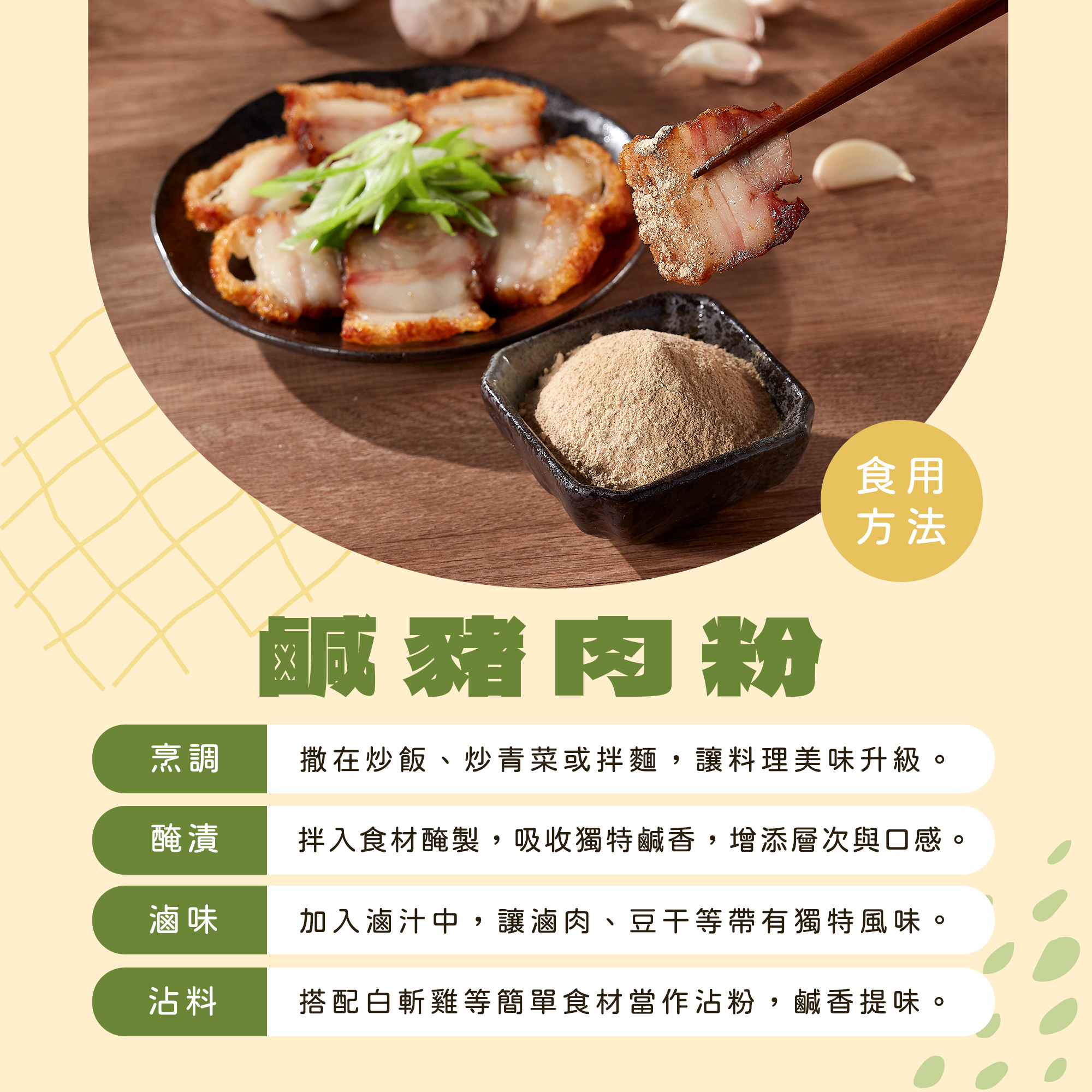 1.依各人喜愛購買肉品,均勻抹上鹹豬肉調味品,可酌量添加打碎脫膜的蒜頭。按壓五分鐘,放入冰箱冷藏即可。