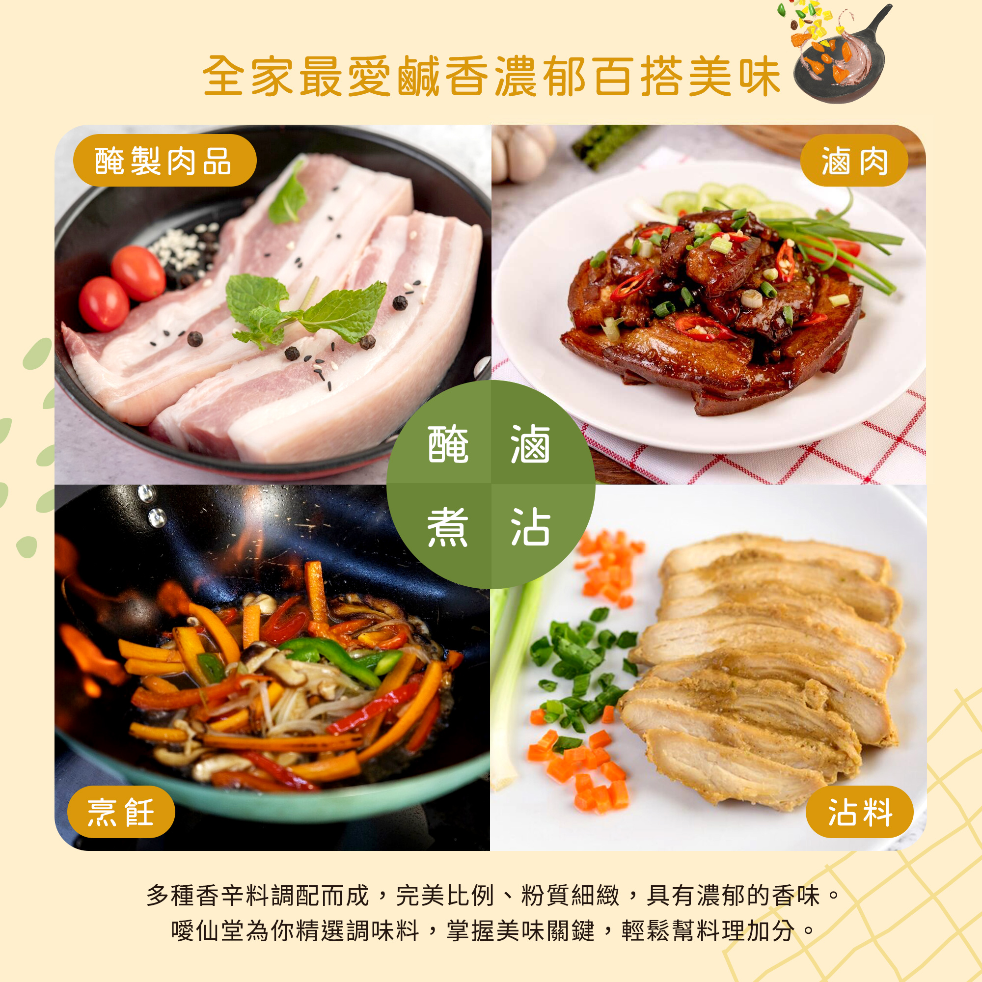 以多種香辛料調配而成,其具有濃郁的香味,粉質細緻,主要用於烹調、醃、滷、煮肉類等,可達到去腥、增香作用。 適用於醃肉、肉品加工、餡料調配、醬類調配、五香豆干、茶葉蛋。家傳獨家秘方調配口味,純天然,絕無添加物,噯仙堂獨家秘方,完美比例,頂級美味,無人能及。