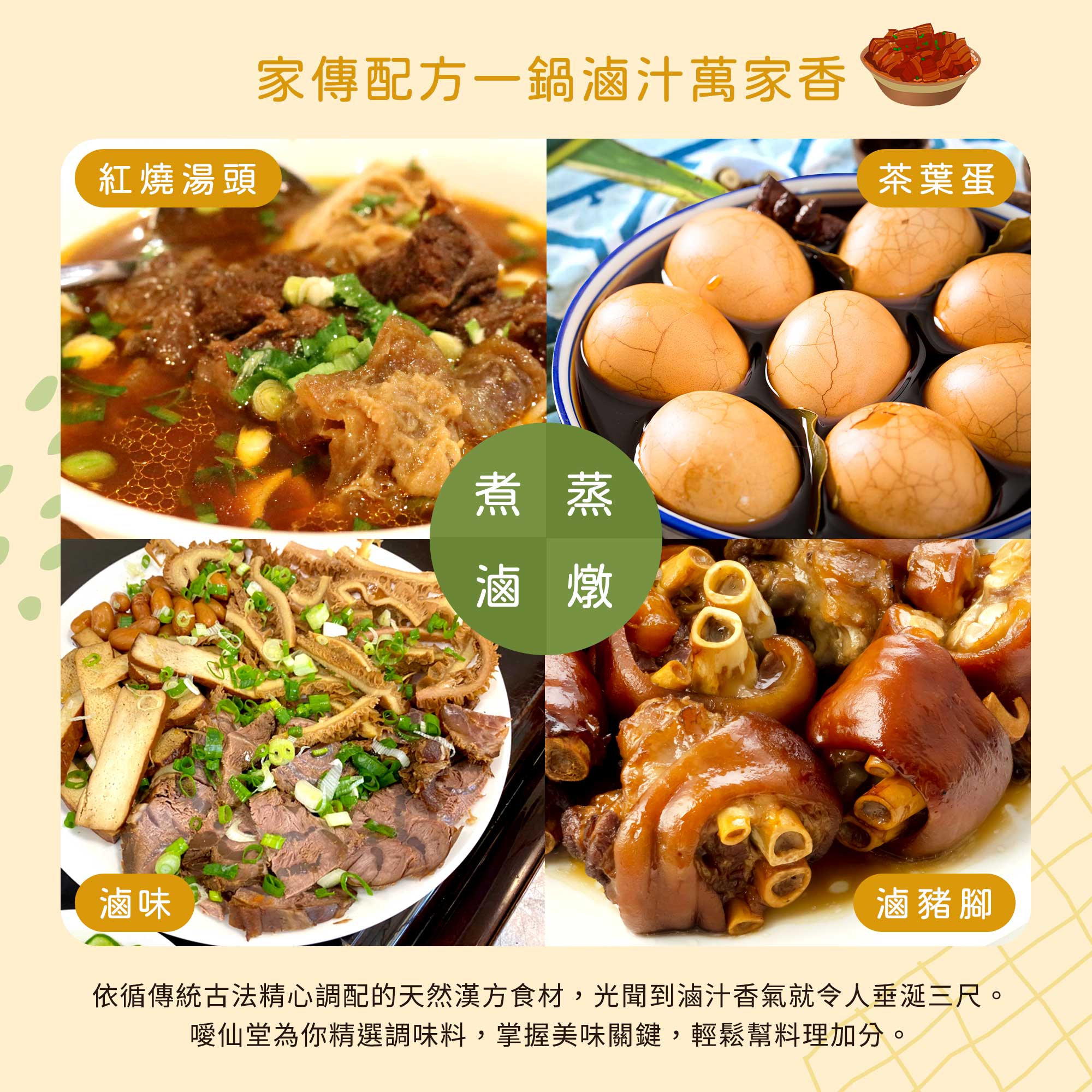 嚴選漢方藥材,家傳獨家秘方調配口味,純天然,絕無添加物,噯仙堂獨家秘方,完美比例,可用於滷味、滷肉、紅燒牛肉、紅燒湯、滷豬腳、茶葉蛋。頂級美味,無人能及。