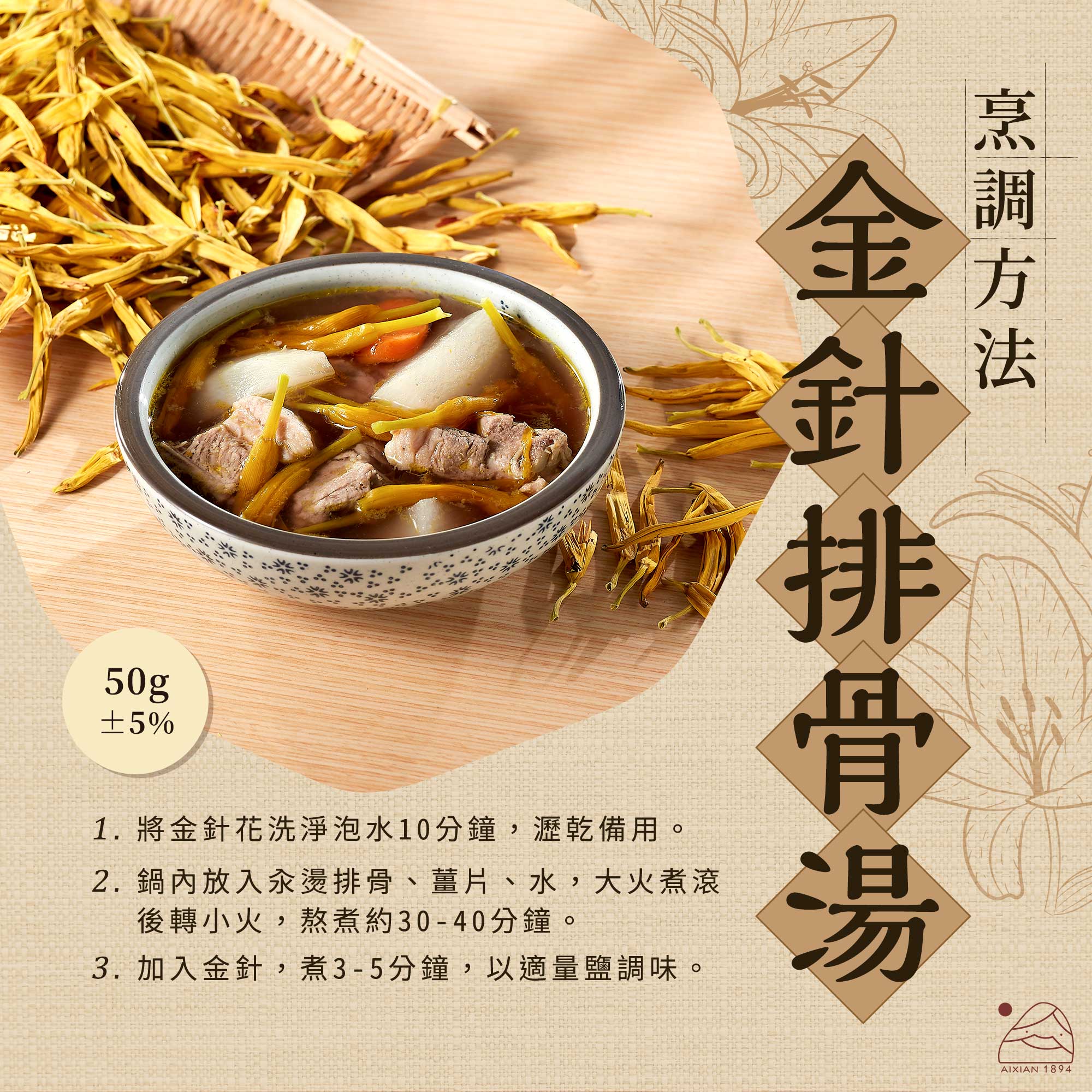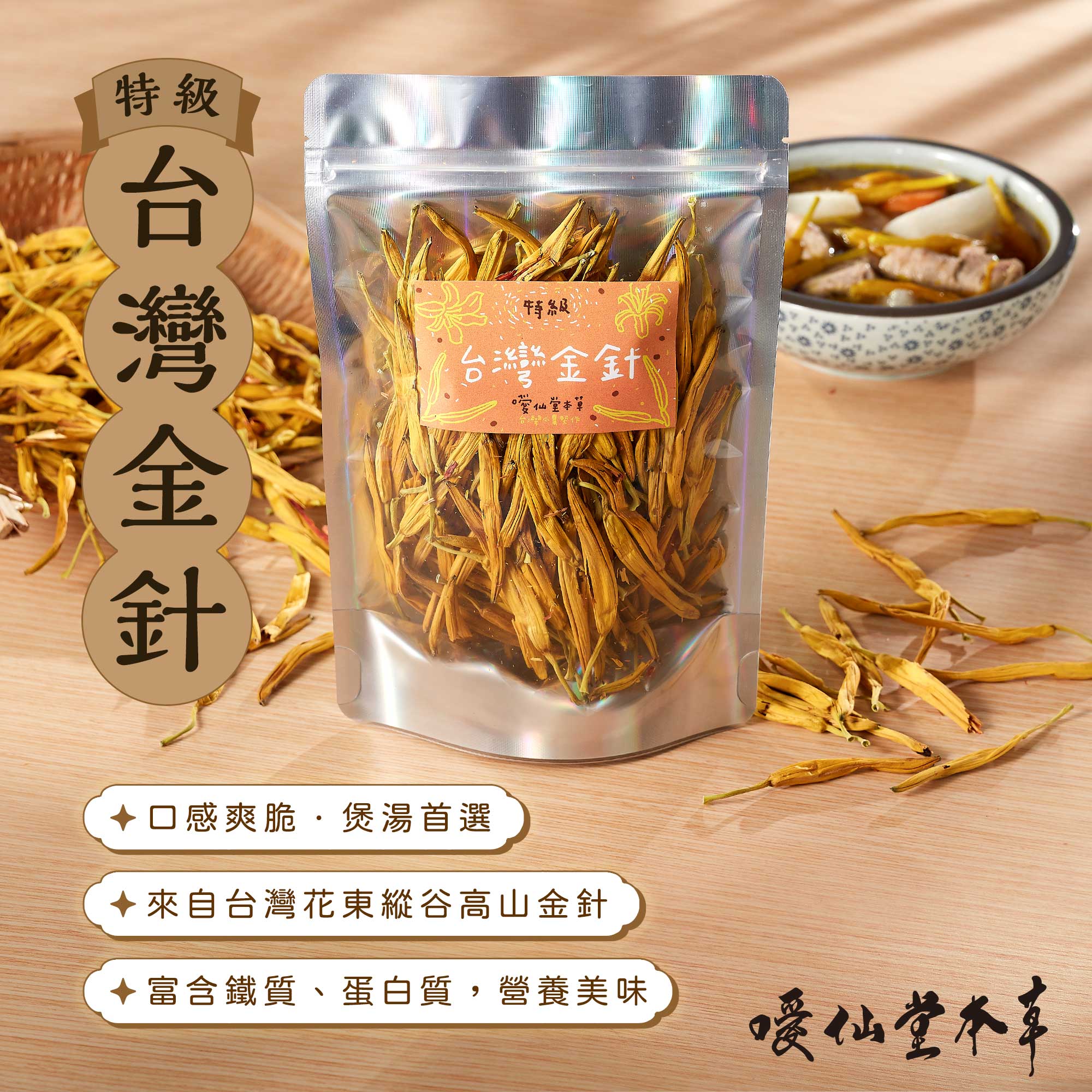 金針富含蛋白質,鐵質含量更為波菜的20倍,噯仙堂嚴選無二氧化硫、無防腐劑,通過認證,產自台灣花東縱谷高山金針。